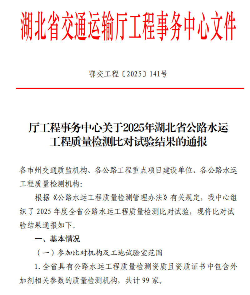 近日,湖北省交通運(yùn)輸廳工程事務(wù)中心正式公布2025年度全省公路水運(yùn)工程質(zhì)量檢測(cè)比對(duì)試驗(yàn)結(jié)果。本次比對(duì)試驗(yàn)是全省檢測(cè)行業(yè)一項(xiàng)權(quán)威性強(qiáng)、參與面廣的專業(yè)能力檢驗(yàn),共吸引99家具備資質(zhì)的檢測(cè)機(jī)構(gòu)及201家在建公路重點(diǎn)工程工地試驗(yàn)室參與??己?/span>聚焦外加劑和水泥兩類關(guān)鍵工程材料,通過統(tǒng)一標(biāo)樣、同步操作、盲樣檢測(cè)等方式,全面評(píng)估各機(jī)構(gòu)的技術(shù)操作規(guī)范性與數(shù)據(jù)準(zhǔn)確性,對(duì)促進(jìn)全省交通建設(shè)工程質(zhì)量整體提升具有重要意義。
